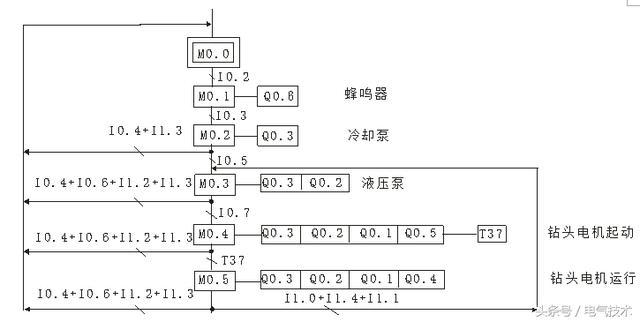 當(dāng)冷卻泵電機和液壓泵電機均起動后,才允許鉆頭電機起動。鉆頭電機起動時,KM1、KM5得電,鉆頭電機Y型起動;8S后,KM1、KM4得電,電機轉(zhuǎn)為△型運行。當(dāng)鉆頭電機工作溫度超過設(shè)定值時,I1.4常開觸點閉合,Q0.7(控制HA2)進(jìn)行閃爍報警,同時將鉆頭電機控制回路(KM1的控制回路)斷開。