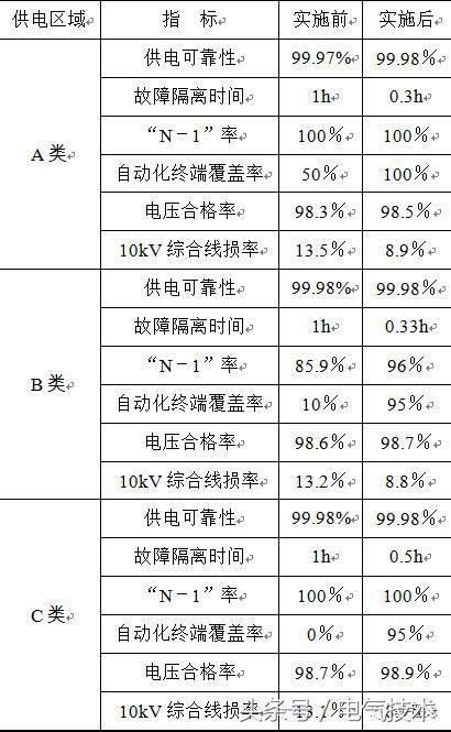 通過改進(jìn)方案的實(shí)施,對(duì)配電自動(dòng)化覆蓋區(qū)域的供電可靠性將會(huì)有明顯的提升,表1給出了工程實(shí)施前后各區(qū)域配電網(wǎng)數(shù)據(jù)指標(biāo)對(duì)比。改造后,A類供電區(qū)域供電可靠性完全達(dá)到99.98%以上,滿足國(guó)網(wǎng)要求,故障隔離時(shí)間由原來的1小時(shí)下降到20分鐘,配電自動(dòng)化覆蓋率達(dá)到100%,N-1校核通過率達(dá)到100%。B類供電區(qū)域供電可靠性完全達(dá)到99.98%以上,滿足國(guó)網(wǎng)要求,故障隔離時(shí)間由原來的1小時(shí)下降到20分鐘,配電自動(dòng)化覆蓋率達(dá)到95%。C類供電區(qū)域供電可靠性完全達(dá)到99.98%以上,滿足國(guó)網(wǎng)要求,故障隔離時(shí)間由原來的1小時(shí)下降到30分鐘,配電自動(dòng)化覆蓋率達(dá)到95%[9]。