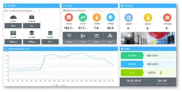 變電所概況顯示某個(gè)變電所的基本信息(電壓等級(jí)、變壓器臺(tái)數(shù)、裝機(jī)容量、運(yùn)行容量)、運(yùn)行狀態(tài)(功率、環(huán)境溫濕度等)、事件信息(遙信事件、遙測(cè)事件)、當(dāng)日用能情況(逐時(shí)用能趨勢(shì)、環(huán)比用能情況);