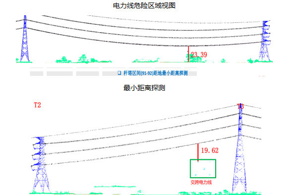 通過(guò)機(jī)載激光雷達(dá)系統(tǒng)和數(shù)據(jù)處理系統(tǒng)為輸電線路監(jiān)護(hù)人員提供數(shù)據(jù)基礎(chǔ),進(jìn)行自動(dòng)化危險(xiǎn)點(diǎn)檢測(cè)發(fā)現(xiàn)輸電線路設(shè)施設(shè)備異常和隱患, 以及線路走廊中被跨越物對(duì)線路的威脅。利用機(jī)載激光雷達(dá)測(cè)量系統(tǒng)獲取的高精度點(diǎn)云可以檢測(cè)建筑物、植被、交叉跨越等對(duì)線路的距離是否符合運(yùn)行規(guī)范,最終自動(dòng)生成電力巡線報(bào)告。