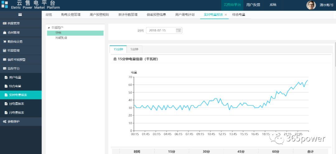 實(shí)時(shí)監(jiān)控用戶的用電情況,以報(bào)表曲線的形式直觀監(jiān)控用戶峰、平、谷的電量信息并為開(kāi)展現(xiàn)貨市場(chǎng)提供了更精準(zhǔn)的數(shù)據(jù)依據(jù)。