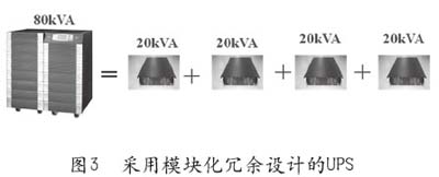 該品牌UPS采用模塊化設(shè)計理念,一臺UPS可由一個到多個功率模塊組成,每個功率模塊為20kVA,用戶只需根據(jù)目前的負(fù)載情況和以后的負(fù)載增加情況,選擇適當(dāng)容量的UPS,等到負(fù)載增加后,用戶只需增加功率模塊,即可方便地增加UPS的容量,而無需新增一臺UPS。這樣可大幅度節(jié)省用戶投資和減少機(jī)房占地面積。更重要的是,能使UPS處于適當(dāng)?shù)呢?fù)載狀態(tài),始終使UPS處于較高轉(zhuǎn)換效率下工作,達(dá)到最大化的節(jié)能,如圖3所示。