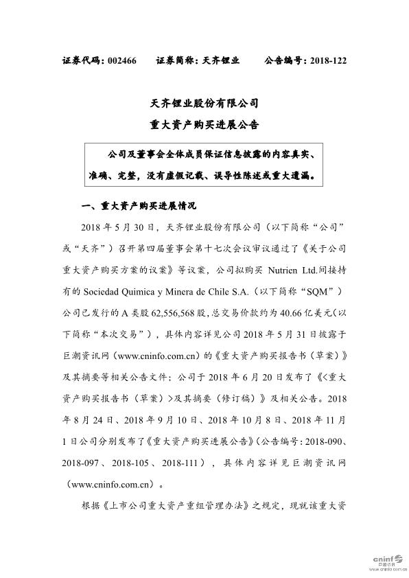 2018年12月3日,天齊鋰業(yè)在智利圣地亞哥證券交易所通過(guò)場(chǎng)內(nèi)交易方式以40 66億美元拍得SQM公司 62,556,568 股 A 類股股份(占 SQM 已發(fā)行股份總數(shù)的 23 77%);預(yù)計(jì)本次交易的價(jià)款支付和股權(quán)交割過(guò)戶相關(guān)手續(xù)將于 2018 年 12 月 5 日前完成(上述時(shí)間為智利當(dāng)?shù)貢r(shí)間)。