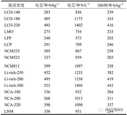 然而,電池形狀各異,本工作中的電芯是指不含封裝材料和引線的所有其他材料,大部分計算是基于電芯的結果。并且,由于電極涂布的允許厚度、不同形狀的電池、非活性材料特征參數(shù)對計算結果有某程度上的影響,該表格計算結果與實際電池會有一定偏差,這與電池制造工藝密切相關。