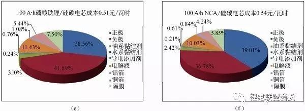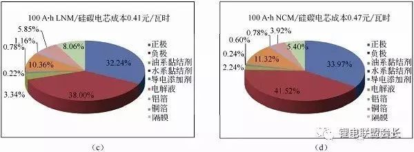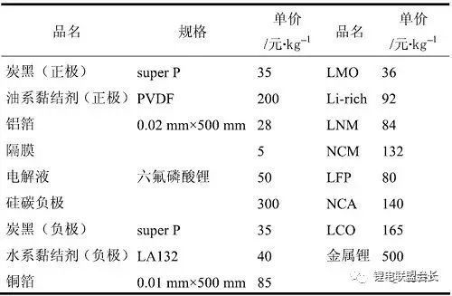 依據(jù)現(xiàn)有產業(yè)化的電芯組成和工藝條件,可以大致推算出不同電池電芯原材料成本價格,所用原材料的成本參見表9。均以100Ah容量的電芯為例,圖4展示了以硅碳為負極與不同正極材料組成的鋰電電芯成本以及以金屬鋰為負極,富鋰,NCM作為正極材料的金屬鋰離子電池電芯的成本。
