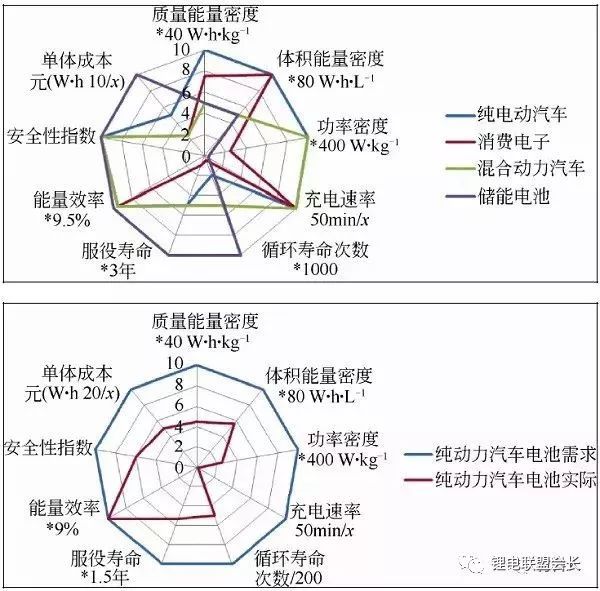 電池的應用不僅需要能量密度,還需功率密度、充電速率、循環(huán)壽命、服役年限、能量效率、安全性指數(shù)、單體電池成本等其他技術指標,電池能否應用取決于某項技術指標能否滿足應用的最低要求,稱之為電池的“木桶效應”。圖5(a)展示不同應用領域主要技術指標的蜘蛛圖,圖5(b)展示純電動汽車各個指標期望值與目前實際值的蜘蛛圖。目前水平與期望值差距較大,需要開發(fā)新的動力電池技術。
