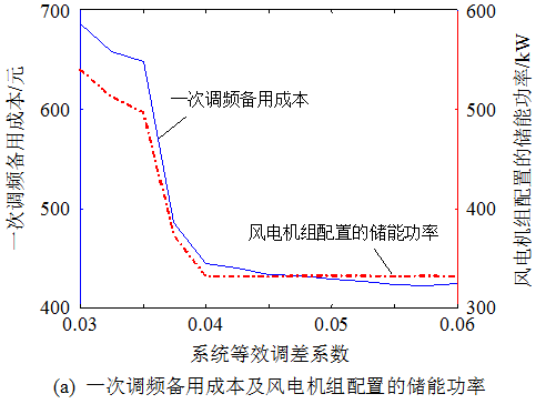 本文基于傳統(tǒng)機(jī)組靜態(tài)頻率特性,研究了微電網(wǎng)孤島運(yùn)行時(shí)柴油機(jī)與風(fēng)儲(chǔ)聯(lián)合調(diào)頻的一次調(diào)頻特性和備用成本,提出了采用機(jī)會(huì)約束規(guī)劃對(duì)微電網(wǎng)一次調(diào)頻備用容量與儲(chǔ)能進(jìn)行優(yōu)化配置的方法。通過機(jī)會(huì)約束規(guī)劃得到了不同置信度下風(fēng)電機(jī)組需配置的儲(chǔ)能功率值,為微電網(wǎng)不同調(diào)差系數(shù)下風(fēng)電機(jī)組、柴油機(jī)一次備用配置提供了優(yōu)化方案。