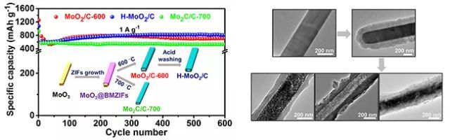 審稿專家對該研究成果給予高度評價,認為金屬有機框架材料輔助合成高儲鋰性能一維鉬基化合物/碳復合材料的方法對多維度碳材料的可控制備及過渡金屬化合物/碳基復合材料的合成具有重要意義,在碳材料構筑和儲能應用方面將會引起廣泛關注。