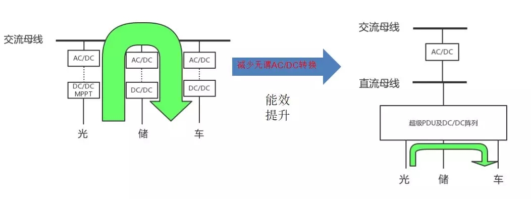 以光伏系統(tǒng)為例,光伏出來(lái)的都是直流電,通過(guò)DC/DC的電壓變換,然后做DC/AC掛到交流母線上。儲(chǔ)能也是通過(guò)直流變交流掛到網(wǎng)上。將光伏發(fā)電傳送到車上的時(shí)候,不但要把直流變成交流,還要再把交流變成直流,這樣能量就會(huì)有無(wú)謂的損失。上圖中右側(cè)是直流微網(wǎng)的架構(gòu),把光伏、儲(chǔ)能和汽車都直接并在直流側(cè),用一個(gè)超級(jí)PDU做能量的分配,實(shí)現(xiàn)在直流端能量的直接的相互的流動(dòng)。