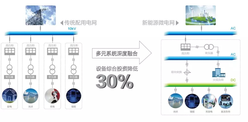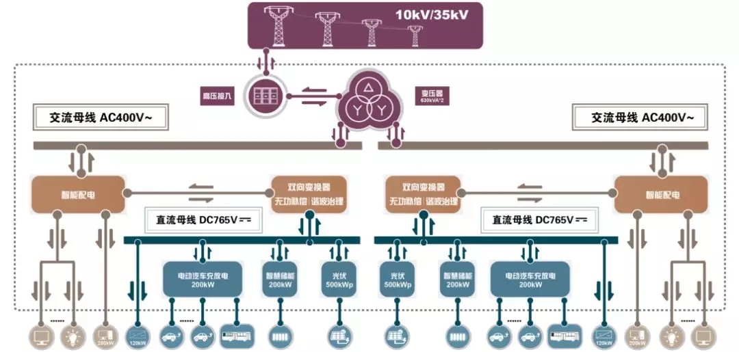 我們把配電、光伏、儲(chǔ)能、充電等電力電子設(shè)備高度集成,做到一個(gè)箱變里面,外面接10kv,配交流和直流兩條母線,交流的負(fù)載做到交流母線上,直流的負(fù)載做在直流母線上,這樣一個(gè)箱變就解決了四個(gè)箱變的問(wèn)題,用一個(gè)箱變的投資代替四個(gè)箱變的投資,設(shè)備的綜合投資包括占地面積、集約程度都會(huì)有一個(gè)很大的進(jìn)步,就會(huì)形成一個(gè)高度集成的系統(tǒng)。