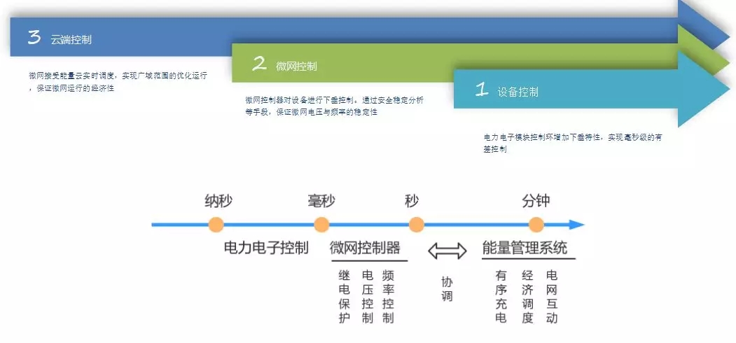 基于就地控制和云端控制等多個(gè)層級(jí)的控制來(lái)實(shí)現(xiàn)微網(wǎng)。就地控制可以實(shí)現(xiàn)毫秒級(jí)的管控,例如大電網(wǎng)跳電、并離網(wǎng)切換、或者云層遮擋了光伏,光伏出力減少等情況,就可以實(shí)現(xiàn)設(shè)備的就地切換,通過(guò)能量管理系統(tǒng)做分鐘級(jí)或者小時(shí)級(jí)的能量負(fù)荷預(yù)測(cè),充放電、經(jīng)濟(jì)的調(diào)度、通過(guò)云端控制。