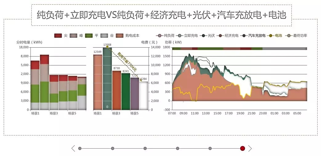 根據(jù)上述情況,我們把光伏引進(jìn)到微網(wǎng)中,園區(qū)的電費(fèi)直接降到了8730元;把車有序的充放電、儲(chǔ)能電池引進(jìn)之后,從右側(cè)的負(fù)荷情況中可以看到低谷時(shí)期的負(fù)荷比以前高了很多,尖峰的時(shí)候比以前低了很多,全天的負(fù)荷比較平滑,電費(fèi)也達(dá)到了50%左右的節(jié)能開支,可以說(shuō)在微網(wǎng)的應(yīng)用上取得了一定的成功。