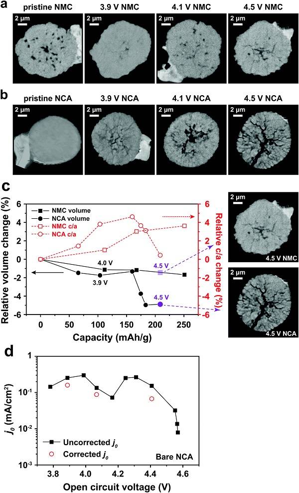TXM層析圖顯示了在(a)NMC333和(b)NCA的各個(gè)顆粒的中點(diǎn)處的切片,所有顆粒具有?10μm的直徑,分別顯示顆粒處于原始狀態(tài)并且以C/3速率分別充電至3.9V,4.1V和4.5V后的圖像。