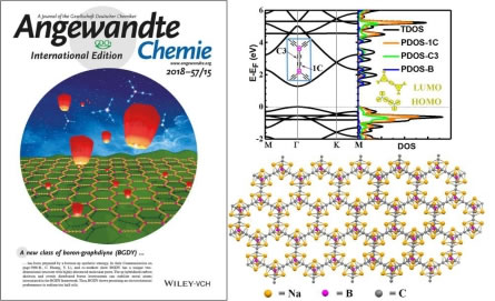 該研究組研發(fā)、制備了一類新型的硼代石墨炔,并通過理論計算與器件性能表征相結(jié)合的方式對其能帶結(jié)構(gòu)、電化學(xué)性能及儲鈉機制進行深入分析。通過理論計算,研究了硼代石墨炔材料的能級在炔鍵(sp碳)與中心雜原子(B)上的分布情況,并進一步分析該類材料能級結(jié)構(gòu)與在實驗中所展現(xiàn)的輸運性能之間的關(guān)系。通過對硼代石墨炔雙層排列構(gòu)型的理論分析結(jié)果與實驗中獲得XRD散射角及分子孔道孔徑與分布情況相結(jié)合,探討了硼代石墨炔分子結(jié)構(gòu)與分子平面堆積方式,以及孔徑結(jié)構(gòu)之間的內(nèi)在聯(lián)系。研究發(fā)現(xiàn),硼代石墨炔對鈉原子特殊的化學(xué)吸附作用,可以獲得極高的理論儲鈉容量。器件測試結(jié)果也證實以硼代石墨炔為電極材料的鈉離子電池,具有優(yōu)異的綜合性能,充分顯示了該類材料在鈉離子電池器件中具備很強的應(yīng)用潛力,開創(chuàng)了新型儲能器件電極材料研究的新方向。相關(guān)研究成果被選為VIP文章發(fā)表在《德國應(yīng)用化學(xué)》上。