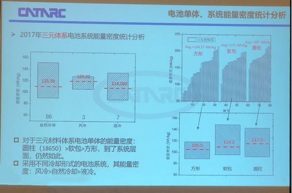 王芳提到,冷卻方式方面,中汽中心共比較了96款車型的冷卻方式,根據(jù)所對比出的數(shù)據(jù)得出的結(jié)論不是很準(zhǔn)確。因為在所有檢測的96款車型中只有3款使用了風(fēng)冷,7款使用了液冷。通過數(shù)據(jù)對比發(fā)現(xiàn),使用風(fēng)冷的動力電池能量密度最高,其次是自然冷,液冷最低,她解釋道:這其實因為風(fēng)冷數(shù)據(jù)過少,若是相同的電池系統(tǒng),應(yīng)該是自然冷卻最高,然后是風(fēng)冷,其次是液冷,因為風(fēng)冷和液冷相比自然冷卻,需要的額外零部件增加了電池系統(tǒng)重量,并且在使用中需要額外消耗電力。
