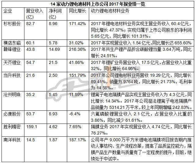 14家動(dòng)力鋰電池材料上市公司2017年報(bào)大比拼
