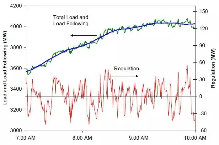 為了維持系統(tǒng)可靠性,電網(wǎng)需要實(shí)時(shí)平衡電力供給和需求,電網(wǎng)運(yùn)營(yíng)商密切關(guān)注負(fù)荷波動(dòng)情況,需要預(yù)測(cè)負(fù)荷和提前安排發(fā)電計(jì)劃,但是難免會(huì)有短期的負(fù)荷預(yù)測(cè)錯(cuò)誤或發(fā)電機(jī)組出力意外波動(dòng)。由于發(fā)電和負(fù)荷需要近乎實(shí)時(shí)平衡,因此這些秒級(jí)到分鐘級(jí)的突然波動(dòng)需要實(shí)時(shí)平衡,電網(wǎng)運(yùn)營(yíng)商依賴“調(diào)頻”資源調(diào)節(jié)微小的電力供需錯(cuò)配,調(diào)頻資源根據(jù)運(yùn)營(yíng)商信號(hào)自動(dòng)調(diào)節(jié)出力以平抑短期波動(dòng)。