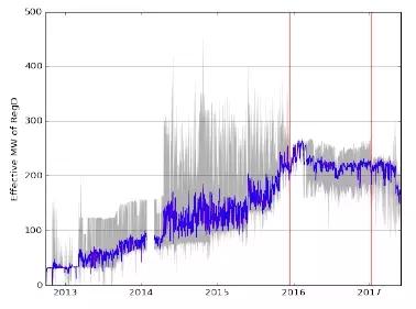 調(diào)頻輔助服務(wù)市場(chǎng)規(guī)則調(diào)整后RegD資源所提供的有效任務(wù)量降低了。圖3展現(xiàn)了效益因子調(diào)整后RegD任務(wù)量變化情況。引入快速信號(hào)之后,RegD資源調(diào)節(jié)任務(wù)量逐步提高,儲(chǔ)能項(xiàng)目建設(shè)也隨之加快。2015年12月短期市場(chǎng)調(diào)整后RegD資源調(diào)節(jié)任務(wù)量增長(zhǎng)趨勢(shì)終止。這些調(diào)整限制了日內(nèi)每小時(shí)RegD任務(wù)量。最終,2017年1月信號(hào)規(guī)則調(diào)整導(dǎo)致了RegD任務(wù)量出現(xiàn)下降。