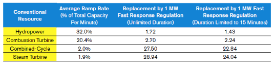 發(fā)電廠等傳統(tǒng)資源通過(guò)調(diào)節(jié)轉(zhuǎn)速響應(yīng)調(diào)頻信號(hào),存在時(shí)間延遲。換句話講,電廠調(diào)節(jié)出力需要花費(fèi)時(shí)間。儲(chǔ)能資源幾乎可瞬時(shí)調(diào)節(jié),既在一分鐘之內(nèi)實(shí)現(xiàn)100%的功率調(diào)節(jié)。2008年太平洋西北國(guó)家實(shí)驗(yàn)室研究發(fā)現(xiàn)1 MW快速調(diào)節(jié)資源可提供等效調(diào)節(jié)服務(wù)為1.7 MW水力發(fā)電機(jī)組、2.7 MW的燃?xì)鈾C(jī)組和29 MW 燃煤機(jī)組。