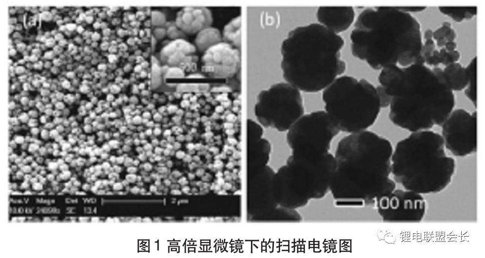 1碳負極材料:此種類型的材料無論是能量密度、循環(huán)能力,還是成本投入等方面,其都處于表現(xiàn)均衡的負極材料,同時也是促進鋰離子電池誕生的主要材料,碳材料可以被劃分為兩大類別,即石墨化碳材料以及硬碳。其中,前者主要包括人造石墨以及天然石墨。人造石墨的形成過程為:在2500℃以上的溫度中,將軟碳材料進行石墨化處理之后得到,MCMB屬于人造石墨中比較常用的一種,其結(jié)構(gòu)為球形,表面質(zhì)地較為光滑,直徑大約為5-40μm。由于受其表面光滑程度影響,使電極表面以及電解液之間發(fā)生反應(yīng)的幾率降低,進而降低了不可逆容量。同時,球形結(jié)構(gòu)能夠方便鋰離子在任何方向進行嵌入和脫出活動,對保障結(jié)構(gòu)穩(wěn)定具有較大的促進作用。天然石墨也具有諸多優(yōu)勢,其結(jié)晶度較高、可嵌入的位置較多,并且價格較低,是較為理想的鋰離子電池材料。但其也存在一定的弊端,例如在與電解液反應(yīng)時,相容性較差,在進行粉碎時表面存在諸多缺陷等,這都將對其充電或放電的性能產(chǎn)生較大的不利影響。此外,硬碳的形成過程為:在2500℃的狀態(tài)下,難以實施石墨化的碳材料,其主要為高分子化合物的熱解碳,通過高倍顯微鏡能夠看出,其是由許多納米小球堆積而成,整體呈現(xiàn)出花團簇狀,具體如圖1所示。在其表面具有大量納米孔的無定形區(qū)域,在容量方面遠遠超過石墨的標準容量,進而對循環(huán)能力產(chǎn)生較大的不利影響。