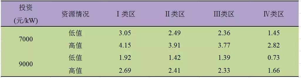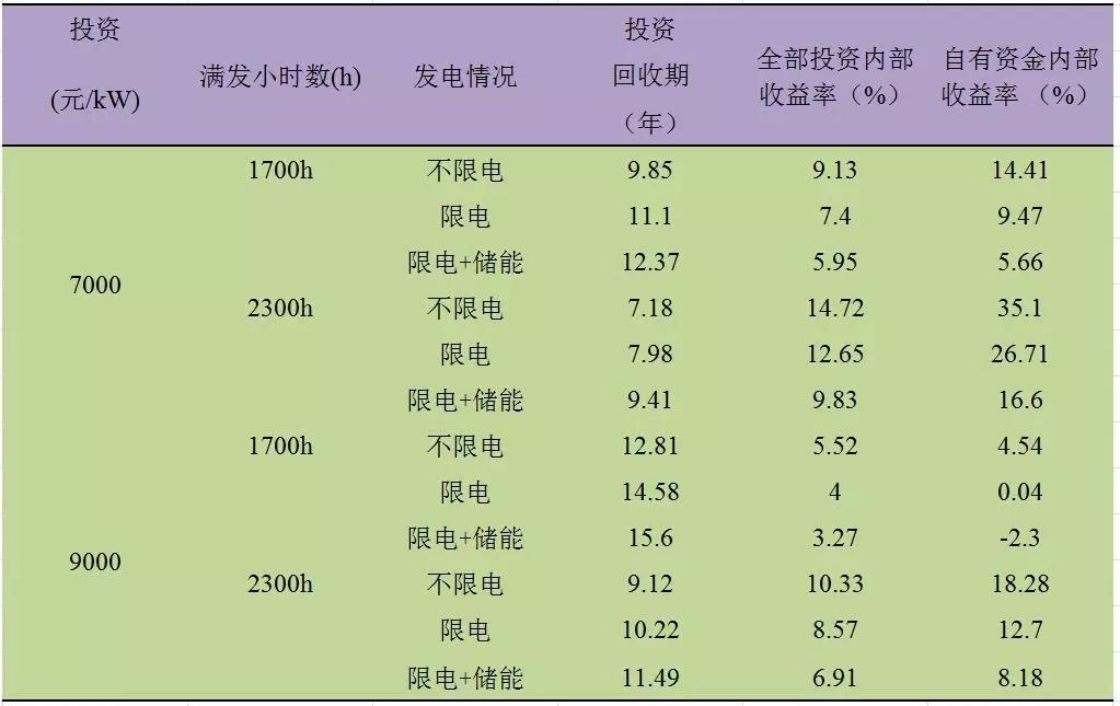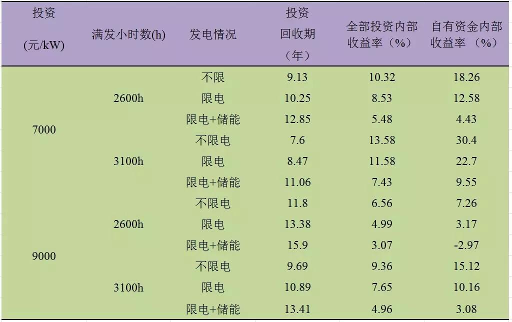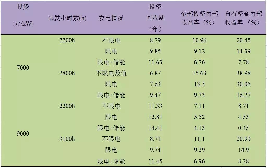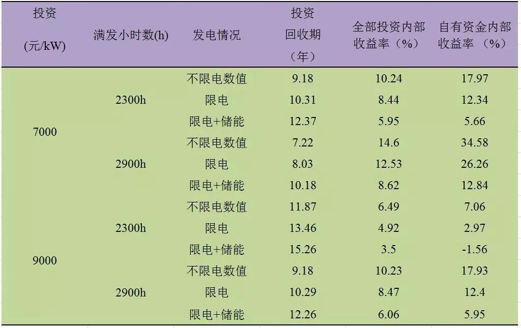 Ⅱ類(lèi)電價(jià)區(qū)的滿(mǎn)發(fā)小時(shí)數(shù)在2300h-2900h之間。通過(guò)測(cè)算,經(jīng)濟(jì)性指標(biāo)匯總結(jié)果匯總?cè)绫?所示: