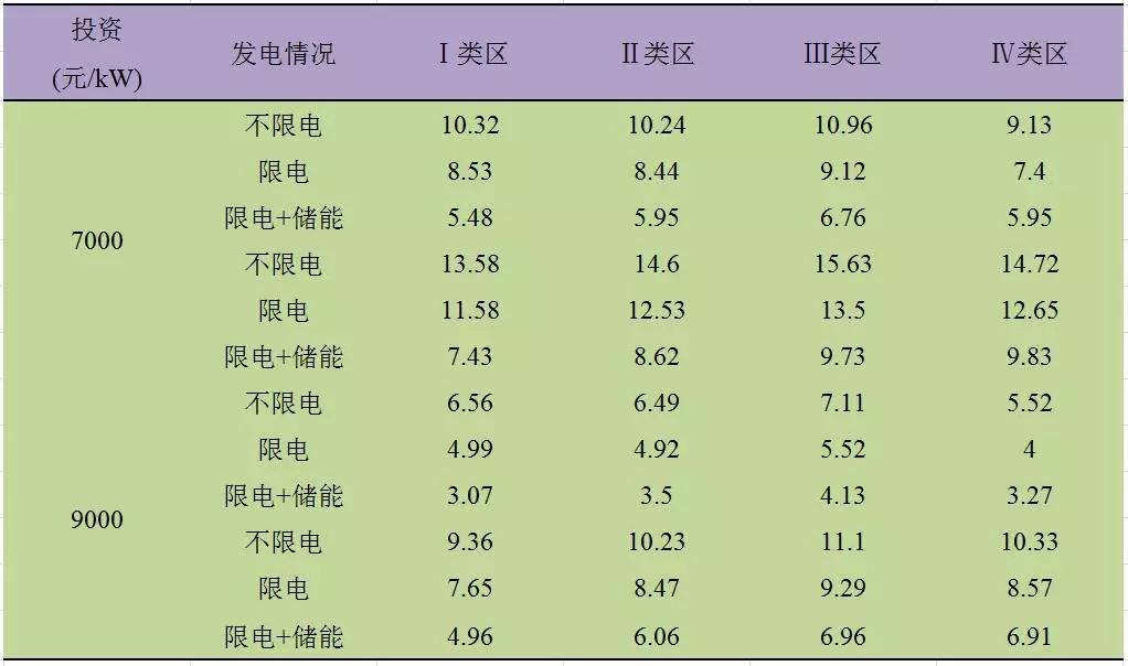 在能控制總成本的條件下,加入儲(chǔ)能設(shè)備有些資源區(qū)是可以滿(mǎn)足全投資8%收益率、資本金12%的要求的;通過(guò)數(shù)據(jù)對(duì)比,Ⅲ類(lèi)電價(jià)區(qū)的收益情況要好于Ⅰ類(lèi)電價(jià)區(qū)和Ⅱ類(lèi)電價(jià)區(qū)。