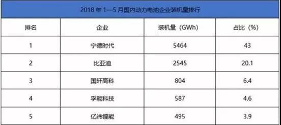 2018年1-5月全國動力電池實現(xiàn)裝機總電量12.67GWh,同比增長248.22%。其中,新能源乘用車動力電池裝機電量達7.12Gwh,裝機總電量前十動力電池企業(yè)合計達6.75Gwh,占整體的95%。