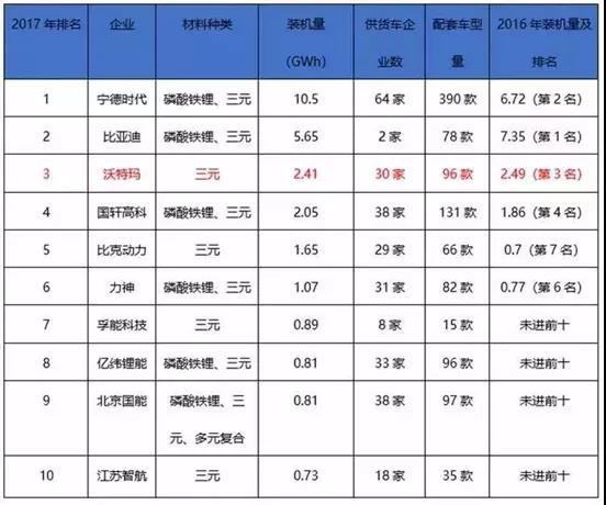 根據(jù)資料統(tǒng)計,占據(jù)2017年國內(nèi)動力電池裝機量排行榜前三的是,寧德時代、比亞迪和沃特瑪三大企業(yè),具體情況如下表:
