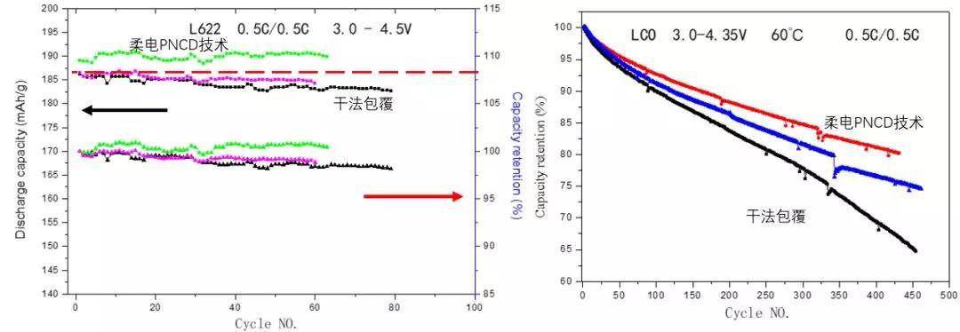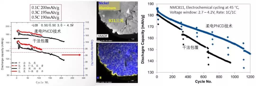 近日,柔電科技在廣州舉行的2018年亞洲動(dòng)力電池與儲(chǔ)能技術(shù)峰會(huì)上,提出了高容量、高電壓、耐高溫鋰電池材料的解決方案。通過自主開發(fā)的精準(zhǔn)納膜包覆與摻雜技術(shù)(Precise Nano Coating and Doping, 簡(jiǎn)稱PNCD),可以大幅提升現(xiàn)有鋰電池正負(fù)極材料的循環(huán)性能、耐高電壓性能以及耐高溫性能。通過和國內(nèi)外多家知名材料企業(yè)的合作,該技術(shù)在高電壓4.5V鈷酸鋰、4.5V中鎳三元(532和622型)、常壓高鎳三元(811和NCA型)以及富鋰錳基都顯示出比同類產(chǎn)品性能有明顯的提升。通過該技術(shù),LiCoO2電池截止電壓可以提升到4.5 V,在0.1C電流密度下容量接近200mAh/g,C/2的倍率下容量達(dá)到190 mAh/g,100圈以后容量保持在95%以上。而532和622三元的中鎳高電壓(4.5V)容量達(dá)到~190mAh/g, 循環(huán)100次后衰減<1%。 而811三元在45度下循環(huán)壽命可達(dá)到1200圈,未處理的811材料只有600圈;而24小時(shí)脹氣率也只有未處理電池的60%(以上數(shù)據(jù)均來自于軟包電池)。