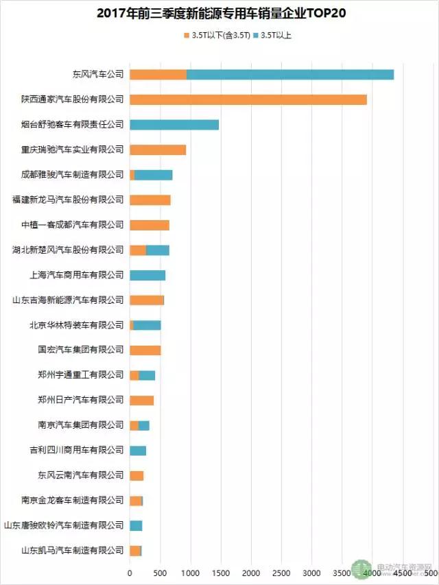 前三季度,3.5T以下(含3.5T)的新能源專用車銷量最多的企業(yè)為陜西通家,交付了3902臺(tái),之后為東風(fēng)汽車、重慶瑞馳、福建新龍馬、中植一客、山東吉海、國宏汽車,銷量在500臺(tái)以上;3.5T以上的新能源專用車銷量最多的企業(yè)是東風(fēng)汽車,交付了3422臺(tái),之后為煙臺(tái)舒馳、成都雅駿、上海汽車商用車,銷量在500臺(tái)以上。