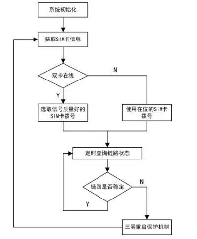 其中,判斷SIM卡在位狀態(tài)為兩層測試,兩次獲取失敗才會判定為不在位,如果在位,則挑選通信質量較好的SIM卡進行撥號,然后進一步通過“PPP設備是否在位、IP地址是否正確、周期內是否產生流量”判斷鏈路穩(wěn)定質量,如果不穩(wěn)定則需重啟設備。