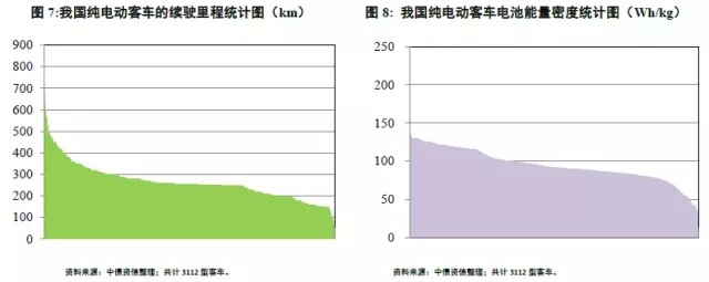 其中,最長續(xù)駛里程車型達到892km,該車整車質(zhì)量14,900kg,動力電池質(zhì)量達4,310kg,僅次于所有車型中4,500kg的動力電池最高質(zhì)量,電池能量密度91.4Wh/kg。從動力電池的能量密度角度看,目前乘用車選用的動力電池分布在13.8Wh/kg~237.9Wh/kg范圍內(nèi)(不含采用超級電容的3型客車),同時僅有4款車型的能量密度超過150Wh/kg,眾數(shù)值100.0Wh/kg,中數(shù)值92.0Wh/kg;大多數(shù)車型的能量密度集中在80~120Wh/kg的范圍。由于客車可以容納更大質(zhì)量的動力電池,因而客車對于電池能量密度需求的范圍彈性較大。