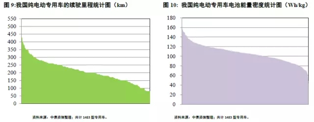 專用車方面,車型多樣,用途不一,類似環(huán)衛(wèi)車、運輸車等車輛亦可以容納較大質(zhì)量的動力電池?,F(xiàn)階段1,483型車中,續(xù)駛里程從80km~543km不等,眾數(shù)值200km,中數(shù)值201km;有20型車的續(xù)駛里程在400km及以上,165型車的續(xù)駛里程在300km及以上。其中,最長續(xù)駛里程車型達到543km,該車整車質(zhì)量2,980kg,動力電池質(zhì)量達670kg,電池能量密度138.8Wh/kg。從動力電池的能量密度角度看,目前乘用車選用的動力電池分布在43.7Wh/kg~162.5Wh/kg范圍內(nèi),眾數(shù)值100.0Wh/kg,中數(shù)值106.5Wh/kg;同時僅有31款車型的能量密度超過150Wh/kg,大多數(shù)車型的能量密度集中在80~120Wh/kg的范圍。