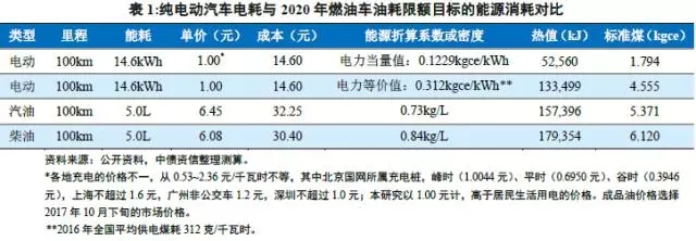 本研究以純電動乘用車和傳統(tǒng)燃油乘用車為例,對比兩者單位里程的直接能源輸入,初步分析純電動乘用車與燃油乘用車的能源消耗水平。國務院發(fā)布《節(jié)能與新能源汽車產(chǎn)業(yè)發(fā)展規(guī)劃(2012-2020年)》設定,2020年乘用車新車平均燃料消耗量達到5.0L/100km;而目前大多數(shù)乘用車的實際使用油耗高于此目標值。作為對比,本研究前述統(tǒng)計中純電動乘用車能耗中位數(shù)為14.6kWh/100km。以純電動乘用車的當前平均表現(xiàn)技術數(shù)值,對比2020年新車的目標油耗值,可以看出,純電動乘用車的節(jié)能效應明顯。以熱當量對比的熱值,純電動乘用車能耗僅為燃油車能耗的29.3%~33.4%;如考察火力發(fā)電的熱消耗,以等價值計算,純電動乘用車也比燃油車的能耗低12~15%。同時,不考慮充電與加油的便利程度,若僅考察燃油和充電的物價,充電的直接能源使用成本亦明顯低于燃油。具體對比如表1所示。因而從能源使用的角度看,純電動乘用車確實有明顯的節(jié)能效益。