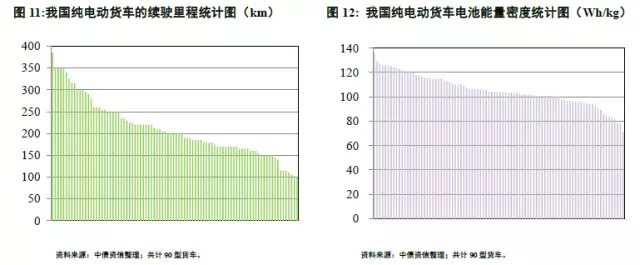 貨車方面,現(xiàn)階段90型車中,續(xù)駛里程從100km~385km不等,眾數(shù)值170km,中數(shù)值200km;有12型車的續(xù)駛里程在300km及以上,48型車的續(xù)駛里程在200km及以上。其中,最長續(xù)駛里程車型達到385km,該車整車質(zhì)量3,450kg,動力電池質(zhì)量達866kg,電池能量密度95.8Wh/kg。從動力電池的能量密度角度看,目前乘用車選用的動力電池分布在71.4Wh/kg~136.4Wh/kg范圍內(nèi),眾數(shù)值100.7Wh/kg,中數(shù)值104.0Wh/kg;無車型的能量密度超過150Wh/kg。