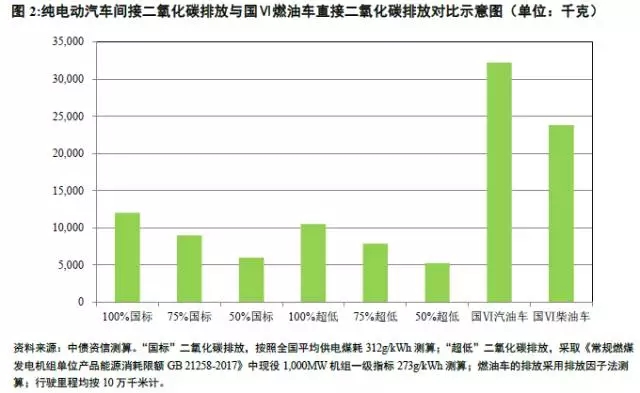 另外一個方面,從溫室氣體排放的角度測算,火電機組分別按照2016年全國供電煤耗312g/kWh和最新國家標準《常規(guī)燃煤發(fā)電機組單位產(chǎn)品能源消耗限額GB21258-2017》中現(xiàn)役1,000MW機組一級指標273g/kWh進行測算。測算結(jié)果如圖2所示,純電動汽車的二氧化碳間接排放,亦顯著低于燃油車輛的直接排放,這與火電廠能源利用效率高于普通車輛的燃油發(fā)動機有關(guān),而柴油車比汽油車更高的熱效率也反映在柴油車更低的二氧化碳排放水平上。