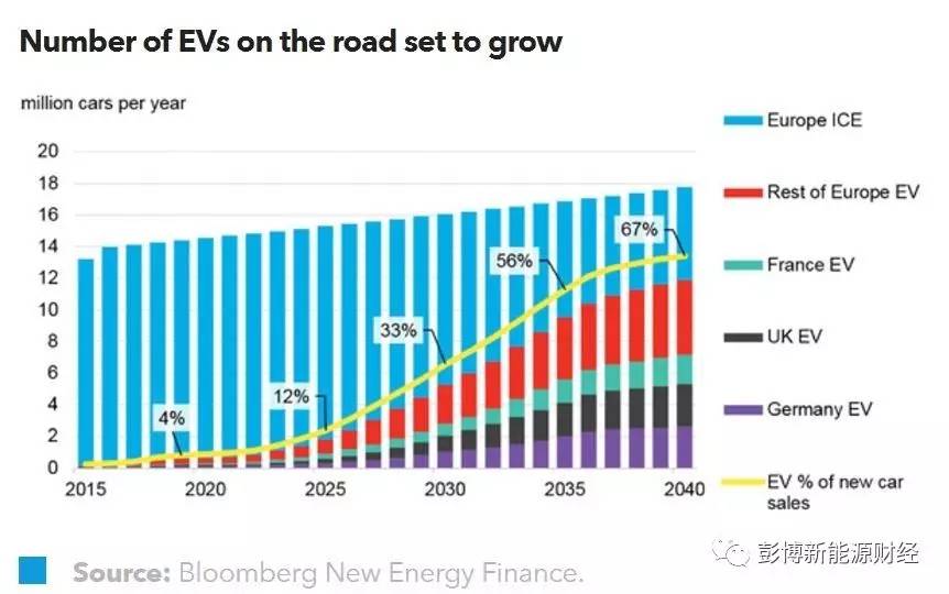 歐洲各國(guó)與各大企業(yè)宣布大力投資發(fā)展電動(dòng)汽車(chē)已不是什么新鮮事兒了。瑞典汽車(chē)制造商沃爾沃(Volvo)于本周宣布,在2019年之后,該公司推出的新車(chē)產(chǎn)品,將僅限于混合動(dòng)力車(chē)或純電動(dòng)汽車(chē)。法國(guó)的環(huán)境部長(zhǎng)宣布,法國(guó)將努力在2040年之前達(dá)到禁止銷(xiāo)售以汽油與柴油為動(dòng)力汽車(chē)的目標(biāo)。在這一大背景下,彭博新能源財(cái)經(jīng)出版了最新的預(yù)測(cè)報(bào)告。在該報(bào)告中我們預(yù)測(cè):至2040年,歐洲新售車(chē)中將有67%的車(chē)為電動(dòng)車(chē)。