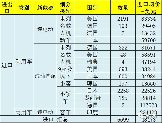 從均價看,新能源車的均價是7.5萬美元,與特斯拉的進口價格相近,說明其為主體。而客車的進口僅有3臺,也是沒啥意義的。