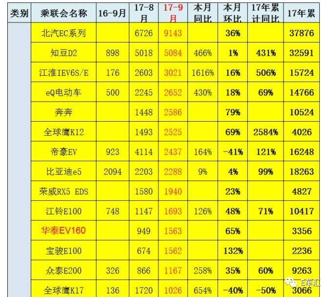 與微型車(chē)形成明顯反差的是A級(jí)電動(dòng)車(chē),今年以來(lái)銷(xiāo)售最好的A級(jí)電動(dòng)車(chē)便是帝豪EV和比亞迪e5、秦EV等車(chē)型。但在9月份,除比亞迪e5保持較好狀態(tài)外,其余幾款車(chē)型銷(xiāo)量并不理想。