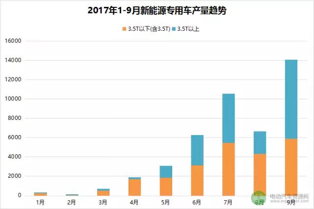 近日,電動(dòng)汽車(chē)資源網(wǎng)對(duì)新能源專(zhuān)用車(chē)2017年前三季度的產(chǎn)銷(xiāo)情況進(jìn)行了梳理。9月,新能源專(zhuān)用車(chē)產(chǎn)銷(xiāo)分別完成14051臺(tái)和4329臺(tái)。1-9月,新能源汽車(chē)專(zhuān)用車(chē)產(chǎn)銷(xiāo)分別完成43642臺(tái)和19219臺(tái)。2017年前三季度,3 5T以下(含