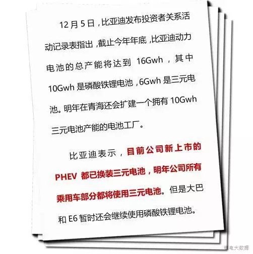③明年,比亞迪的乘用車全部換裝三元電池:比亞迪表示,目前公司新上市的PHEV都已換裝三元電池,明年公司所有乘用車部分都將使用三元電池。大巴和E6暫時還會繼續(xù)使用磷酸鐵鋰電池。