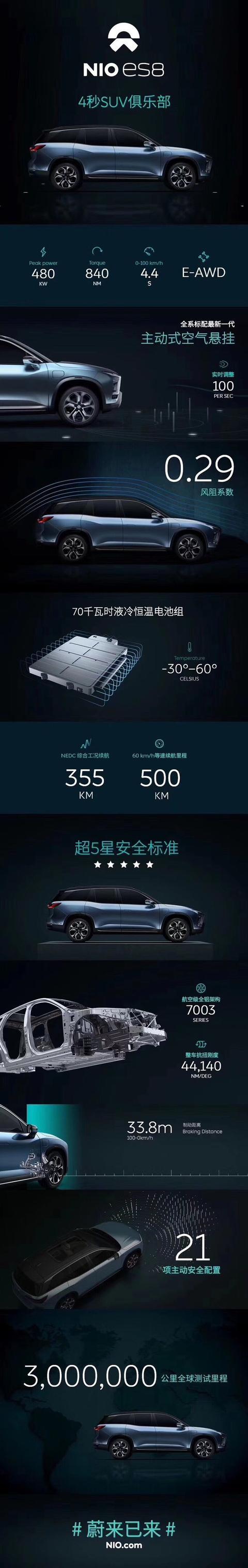 小結(jié):之前很多車友也許對電動車不大感冒,不過這次有備而來的蔚來ES8解決了電動汽車的各個痛點(diǎn),同時帶來全新汽車生活體驗(yàn),相信會對你有所觸動。如果真的要買一款純電動車,我現(xiàn)在唯一推薦你購買的就是這款蔚來ES8。撇開補(bǔ)貼后的售價不說,就憑著蔚來汽車對于汽車的安全、配置、科技、智能,家庭和生活理念虔誠的態(tài)度,就值得全球車友點(diǎn)贊!出色的外觀、內(nèi)飾設(shè)計(jì),良好的裝配工藝、強(qiáng)大的動力系統(tǒng)和全新的汽車生活理念都是蔚來ES8的賣點(diǎn)。隨著電動汽車技術(shù)的不斷升級和對相關(guān)服務(wù)的探索,相信蔚來汽車將為我們真正開啟電動汽車時代,蔚來已來!