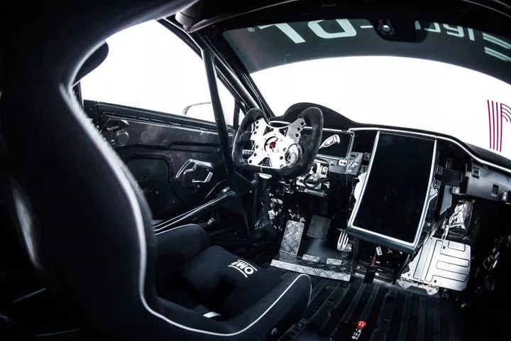 能看得出來,車內(nèi)除了座椅還稍微保留了一些“軟材料”之外,其他的地方幾乎把所有的裝飾性包裹全都拆掉了。門板和地板就直接裸露著金屬,甚至副駕駛面前的手套箱都沒了。其實(shí)這塊屏幕本身也非常重,但由于還需要對這輛進(jìn)行測試和控制,所以沒辦法將它移除。即使是這樣吹毛求疵一般的做減法,也只能讓2.1噸變成1.6噸,仍然屬于賽道上的胖子。但這樣的減肥計(jì)劃效果十分顯著,在不提高電機(jī)功率的情況下,Model S P100D的提速性能被再一次壓榨到極限,達(dá)到了2.1秒的成績。最高時速則與市售版沒有區(qū)別,都是250km/h。或許聽起來這個數(shù)據(jù)并不怎么樣,可能還沒有一些傳統(tǒng)汽油性能車的極限速度高,但在比賽場上,估計(jì)沒有什么機(jī)會能夠讓他們長時間保持在極限速度進(jìn)行沖刺,況且已經(jīng)舉辦了4屆的Formula E的電動方程式賽車也不過是225km/h的極限速度。