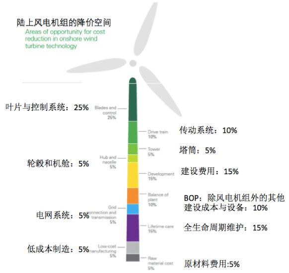BP認(rèn)為未來風(fēng)電項目的綜合成本會在裝機量每增加1倍時下降14%。下降的風(fēng)電項目成本主要來自于(圖四)所示的幾個方面,其中葉片和控制系統(tǒng)成本、傳動系統(tǒng)成本、風(fēng)機運營維護成本的大幅下降是風(fēng)電開發(fā)成本走低的主要推手,而葉片與控制系統(tǒng)價格有望下降25%,是所有風(fēng)電組件中價格下降幅度最大的。