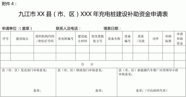 4. 九江市XX縣(市、區(qū))XXX年充電樁建設(shè)補助資金申請表;