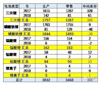 專(zhuān)用車(chē)的三鋰電池,2017年產(chǎn)大于銷(xiāo)較多,2018年裝車(chē)和零售表現(xiàn)較好。