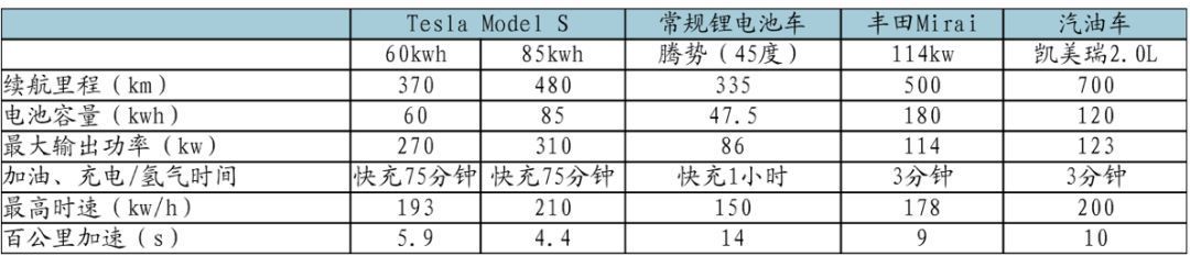 三元電池車、磷酸鐵鋰電池車、燃料電池車及燃油車參數(shù)對比