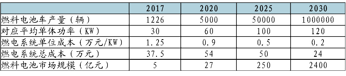 假設(shè)依據(jù)如下:根據(jù)2017年11月發(fā)布的《節(jié)能與新能源汽車技術(shù)路線圖》,我國燃料電池汽車的2020/2025/2030年的發(fā)展目標(biāo)分別為5,000/50,000/1,000,000輛。