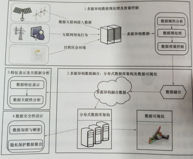 隨著能源互聯(lián)網(wǎng)技術(shù)的發(fā)展和應(yīng)用,互聯(lián)網(wǎng)與用電行為逐步實(shí)現(xiàn)深度融合,體現(xiàn)在大量能源互聯(lián)網(wǎng)數(shù)據(jù)、互聯(lián)網(wǎng)用電行為數(shù)據(jù)、自然環(huán)境數(shù)據(jù)等多源異構(gòu)數(shù)據(jù)共同支撐用電環(huán)節(jié)的網(wǎng)絡(luò)化和智能化,包括節(jié)電負(fù)荷預(yù)測(cè)、錯(cuò)峰調(diào)度等電力消費(fèi)相關(guān)大數(shù)據(jù)在類型、性質(zhì)、形式和內(nèi)容上均存在極大的差異。表現(xiàn)為顯著的多源異構(gòu)特性,雖然為進(jìn)一步的分析與挖掘提供了豐富的可用信息,但由此帶來(lái)的異構(gòu)數(shù)據(jù)源的語(yǔ)義關(guān)聯(lián)問(wèn)題又使其面臨著新的挑戰(zhàn)?;ヂ?lián)網(wǎng)環(huán)境下的電力消費(fèi)大數(shù)據(jù)智能分析技術(shù)路線圖如圖5-17所示。本書針對(duì)能源互聯(lián)網(wǎng)接入數(shù)據(jù)、互聯(lián)網(wǎng)用電行為數(shù)據(jù)、地理社會(huì)環(huán)境數(shù)據(jù)的“規(guī)模龐大”和“異質(zhì)多源”兩個(gè)特性,為智能用電相關(guān)的大規(guī)模多源異構(gòu)數(shù)據(jù)的融合和管理提供新原理與新方法,實(shí)現(xiàn)多源異構(gòu)大數(shù)據(jù)的智能處理及高效運(yùn)算。關(guān)鍵支撐技術(shù)主要包括:智能用電相關(guān)大數(shù)據(jù)的預(yù)處理及質(zhì)量控制;針對(duì)智能用電相關(guān)大數(shù)據(jù)的分布式數(shù)據(jù)庫(kù)架構(gòu)的研究,以及多源異構(gòu)大數(shù)據(jù)的融合及可視化;大規(guī)模多源異構(gòu)數(shù)據(jù)的特征表示技術(shù),以及大規(guī)模多源異構(gòu)數(shù)據(jù)的關(guān)聯(lián)分析模型建立;針對(duì)不同類型用戶實(shí)現(xiàn)身份驗(yàn)證及安全訪問(wèn)控制等。