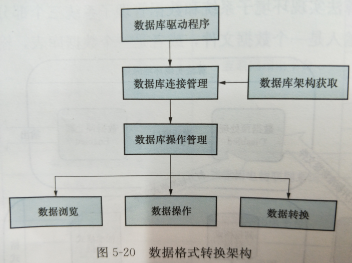 數(shù)據(jù)格式轉(zhuǎn)換部分的架構(gòu)如圖5-20所示,由于涉及對(duì)各種數(shù)據(jù)庫(kù)的訪問(wèn),因此各種數(shù)據(jù)庫(kù)的驅(qū)動(dòng)程序應(yīng)該集中存放在一起,并建立起各種數(shù)據(jù)庫(kù)格式與驅(qū)動(dòng)程序的映射由此構(gòu)建數(shù)據(jù)庫(kù)連接的管理,和數(shù)據(jù)庫(kù)操作的管理通過(guò)獲取數(shù)據(jù)庫(kù)的架構(gòu)信息,完成對(duì)數(shù)據(jù)庫(kù)結(jié)構(gòu)的解析,實(shí)現(xiàn)數(shù)據(jù)庫(kù)在異構(gòu)數(shù)據(jù)源中的重建與數(shù)據(jù)記錄的轉(zhuǎn)存。